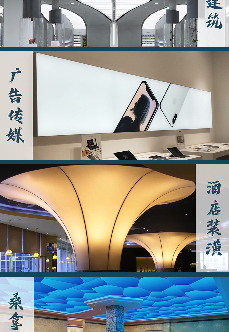 4、现如今很多娱乐场所使用软膜灯箱来装饰,呈现出设计美感,若能够将软膜灯饰转化为广告行业的广告灯箱,一举两得,美观大方,代替传统的塑料灯饰,不易老化,不易变色;